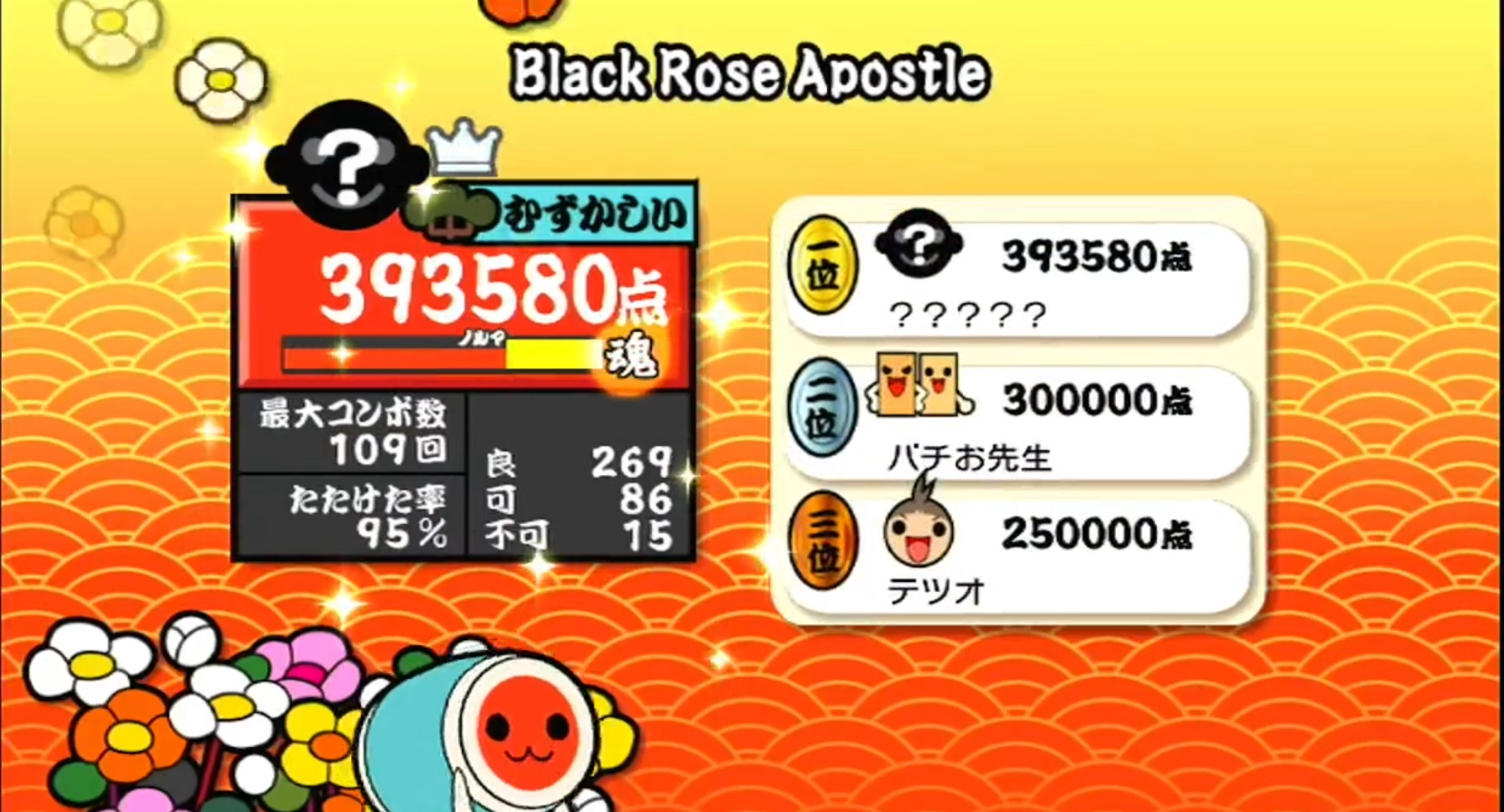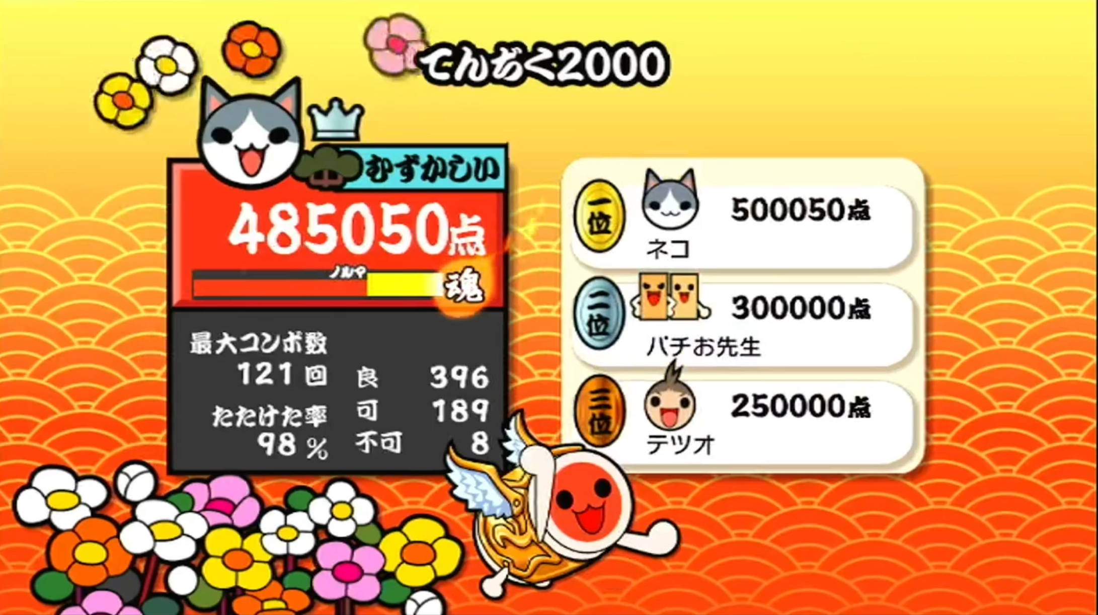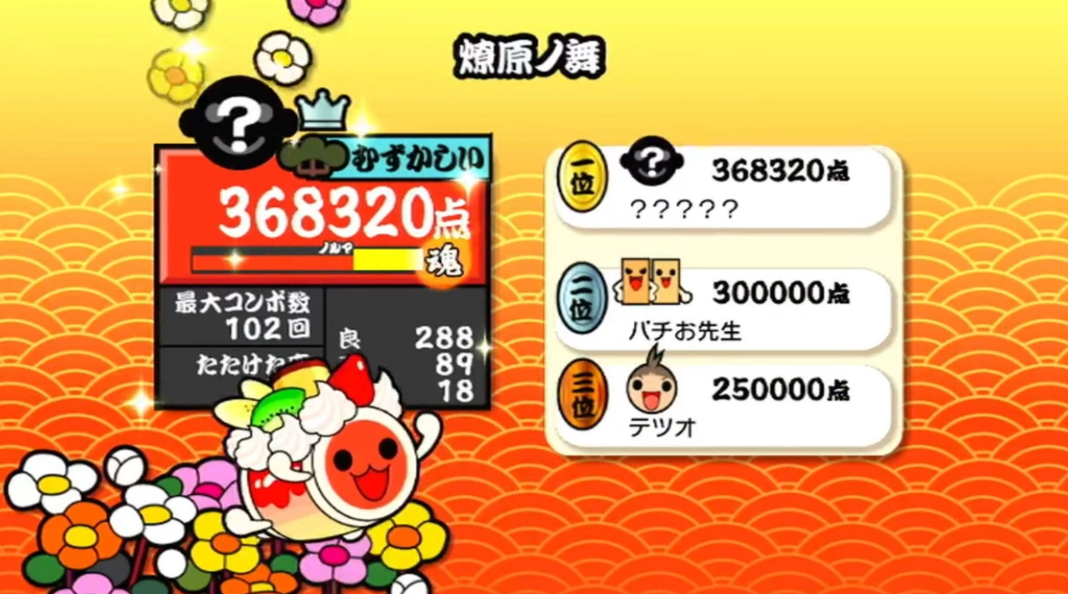 はたラク2000の新記録! はたラク2000(難しい)フル スコア 769660点 最大コンボ数 437回 叩けた率 100% 判定 良 305 可 132 不可 0 5回目のフルコン、うれしかったです!! [0回]